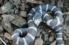 Общая длина достигает 1,5 м. Голова немного вытянутая и сжатая с боков. Туловище массивное. Типовая окраска (вариации «обычная» и «пустынная») состоит из чёрных и белых кольцевых полос, расположенных поочерёдно. Они также заходят на брюхо. В вариации «обычная» полосы узкие, в «пустынной» — широкие. На спине светлые полосы уже, но расширяются на боках. Голова тёмная, с белым пятном между глаз. Нижняя часть головы и кончик морды бледнее, чем верхняя. Существуют также иные цветовые вариации этой змеи: альбиносы, жёлтые, кофейные, чёрно-жёлтые, нитиды, альбиносы с поперечной чёрной полосой.