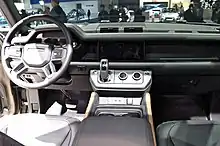 Ключевой элемент архитектуры — поперечная балка из магниевого сплава со встроенными поручнями для рук. На раме из такого же материала закреплены все элементы передней панели. Для отделки интерьера используется ткань, зернистая кожа и износостойкий материал из высокопрочных полиэстеровых волокон. В качестве опций для Land Rover Defender доступны откидное кресло в центре переднего ряда и мягкая складная крыша[6]. На автомобиле дебютирует в информационно-развлекательная система Jaguar Land Rover Pivi Pro, доступ к которой осуществляется через 10-дюймовый сенсорный экран.