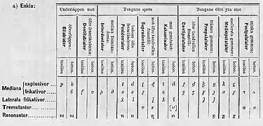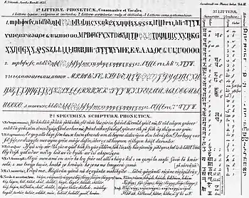 Для алфавита 42 буквы были заимствованы из системы транскрипции, предложенной Карлом Якобом Сундевалем в работе Om phonetiska bokstafver («О фонетических буквах»; Стокгольм, 1856)[6][8][12].