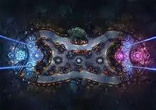 | Магматический зал | Magma Chamber (Магматический зал) — Поле Правосудия для игр «1 на 1» и «2 на 2», которое сначала было официально анонсировано как отдельная карта[37], но позже переработанная в Доминион и отменённая[38]. Карта использовалась во время развлекательного турнира All-Star 2013 в Шанхае. Использованный на турнире Магматический зал напоминал Воющую бездну в другом убранстве. Игра на этом поле продолжалась до выполнения одной из команд двух из трёх условий победы: убить 100 миньонов, снести башню, пустить Первую кровь (1 на 1) или 2 убийства (2 на 2). Оригинальный Магматический зал был похож по структуре на Кристальный каньон и планировался как самая крупная по размеру игровая карта с разнообразными лесными монстрами, дающими усиления, площадками для телепортации и другими особенностями.[39] |