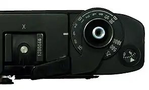 На верхней панели размещена головка ввода светочувствительности фотоплёнки. Значения светочувствительности 6-3200 ISO.