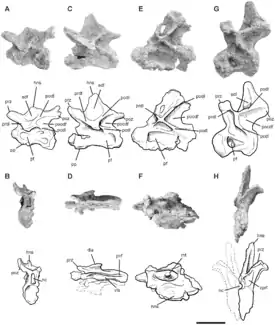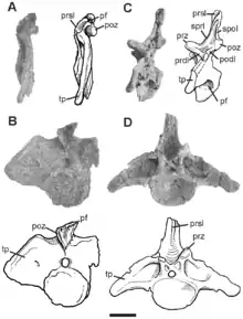 Передние хвостовые позвонки имеют чрезвычайно хорошо развитые поперечные отростки, направленные по ширине тела позвонка, тело позвонка расширено в сторону и ниже, и обладает прочными укрепляющими гребнями на верхней и нижней поверхностях. Они же обладают очень прочными хребтами, идущими между телом позвонка и передними суставными отростками, презигапофизами. Также для них характерны задние суставные отростки, постзигапофизы, с двумя спаренными пневматическими отверстиями на их внутренних основаниях, противоположных совместным граням[9][10]