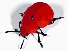 Среднего размера жуки-листоеды (около 1 см), сходные с колорадским жуком. Тело овальное, выпуклое. Усики 11-члениковые. Максиллярные щупики состоят из 4 сегментов (вершинный членик нижнечелюстных щупиков короче предшествующего). Пронотум шире головы. Голова, грудь и надкрылья одноцветные, оранжево-красные, скутеллюм чёрный[1].