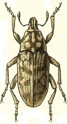 Головотрубка более или менее параллельносторонняя, короткая и толстая. Надкрылья и переднеспинка в более или менее равномерно расположенных мелких блестящих зёрнышках. Верхняя и нижняя части тела в густых белых волосках, на надкрыльях образующих не резкий пятнистый рисунок, вершины надкрылий закруглены вместе. Переднеспинка поперечная, сильно суженная вперёд[1].