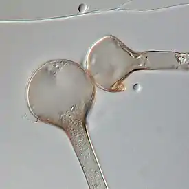 Гетероталличный (раздельнополый) вид. Спорангиофоры до 500 мкм длиной и 4—8 мкм толщиной, неокрашенные, у верхушки иногда коричневатые, прямые (мелкие иногда извитые), отходящие от столонов, редко от субстратного мицелия, одиночные или в мутовках в числе до семи. Столоны 5—17 мкм толщиной, иногда с септой, часто оканчивающиеся крупным спорангием. Ризоиды до 12 мкм толщиной, бесцветные, слабо ветвящиеся. Спорангии 20—35 мкм в диаметре (спорангий на конце столона до 68 мкм), грушевидной формы, бесцветные до сероватых, стенка их гладкая несколько неровной. Колонка 16—27 мкм в диаметре (в конечном спорангии до 62 мкм), у мелких спорангиев често более вытянутая, с бородавковидными отростками на верхушке. Спорангиоспоры 3—6,5 мкм длиной и 2,5—5 мкм шириной, яйцевидные до почти шаровидных, неокрашенные до сероватых.