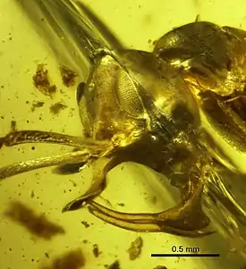 Длина около 5 мм. Длина головы 0,9 мм. Размер глаз 0,38 на 0,25 мм. Длина скапуса 12-члениковых усиков 0,94 мм. Длина груди 1,77 мм. Обладали уникальным среди всех муравьёв строением мандибул и клипеуса. Их челюсти были L-образно изогнуты вверх (имели 2 апикальных зубца) и могли двигаться в вертикальной плоскости. Обладали длинным лопатовидным выростом на голове (между местами прикрепления усиков). Этот рогоподобный вырост отходит от клипеуса (наличника), направлен вперёд и вверх, возвышается над головой. На вентральной поверхности наличника расположена пара специализированных триггерных щетинок. Ноги и усики длинные. Усики состоят из скапуса и 10 члеников жгутика.