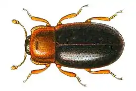 Жук мелких размеров, длиной достигает от 2,5 до 3,5 мм. Надкрылья к основанию слабо сужены, уплощены[1]. Надкрылья и голова чёрные, переднеспинка бурая.