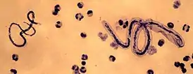 ![]() Микрофилярии Loa loa (справа) и Mansonella perstans (слева) в одной и той же пробе крови | ||||||||||||||