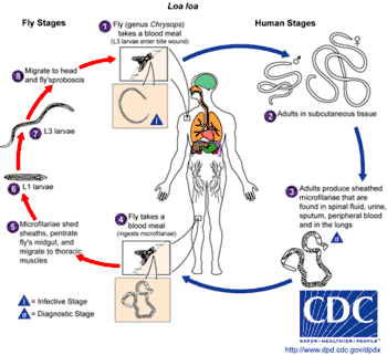 Промежуточными хозяевами и переносчиками червя являются слепни видов Chrysops dimidiata и Chrysops silacea. При укусе (только самки слепней сосут кровь) червь попадает под кожу человеку, находясь в стадии личинки (фаза L3; см. рисунок справа.). Развитие до взрослого, половозрелого червя (макрофилярии) занимает как минимум 3 месяца. Эти черви в указанный период времени обитают в подкожной жировой ткани и могут перемещаться вперед внутри неё со скоростью примерно 1 см в минуту и могут достичь от 1 метра до 20 метров. Продолжительность жизни червя может превышать 20 лет.