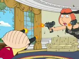 Лоис, вооружённая до зубов, врывается в Овальный кабинет Белого Дома к Стьюи через окно. Происходит перестрелка, а затем и рукопашная с поножовщиной. В последнюю секунду Лоис понимает, что не может убить своего малыша, и Стьюи этим пользуется. От смерти свою жену спасает Питер, застреливший Стьюи.