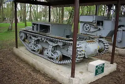 Применительно к одному борту, ходовая часть состояла из шести обрезиненных опорных катков, которые были сблокированы попарно в три тележки и трёх обрезиненных поддерживающих катков. Каждая тележка была подвешена на полуэллиптической листовой рессоре. Ведущее колесо располагалось спереди.