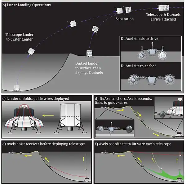 Строительство радиотелескопа планируется осуществить без непосредственного участия человека: роботы-планетоходы DuAxel растянут проволочную сетку диаметром около 1 километра внутри лунного кратера размером от 3 до 5 км. В центре данной конструкции будет размещён подвесной приёмник[1][5].