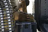 Используемый боеприпас — патрон 7,62 НАТО. Питание патронами может осуществляться из стандартной рассыпной ленты или при помощи механизма беззвеньевой подачи патронов. В первом случае на пулемёт ставится специальный механизм «delinker», осуществляющий извлечение патронов из ленты перед их подачей в пулемёт. Лента подаётся к пулемёту через специальный металлический гибкий рукав от коробов, имеющих типовую ёмкость от 1500 (полный вес 58 кг), до 4500 (полный вес 134 кг) патронов. На тяжёлых вертолётах (CH-53, CH-47) ёмкость патронных коробов для питания одного пулемёта может достигать 10 000 и даже более патронов.