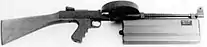 - расположенный слева над пистолетной рукоятью флажковый переводчик видов огня, как у пистолета-пулемёта Томпсона;