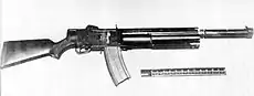 - ствольная коробка в виде двух качающихся на поперечной шпильке половин (upper/lower reciever), как у бельгийской винтовки FN FAL, немецкой StG44 или советских пистолетов-пулемётов Шпагина (ППШ) и Судаева (ППС);