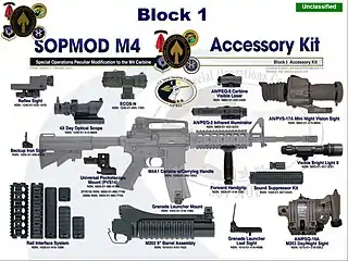 - SOPMOD M4 Accessory Kit (англ. Special Operations Peculiar Modification) — набор компонентов, разработанный Центром наземных операций ВМФ США для расширения функциональности автомата M4A1[13].