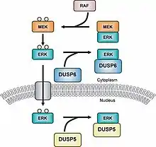 Фосфатазы с двойной специфичностью (DUSP) относятся к семейству протеинтирозинфосафатаз[12]. По внутриклеточной локализации MAPK фосфатазы (MKP) делятся на три типа: I, II и III. Ферменты I типа находятся в клеточном ядре, фосфатазы II типа локализуются в цитоплазме, а III типа — могут находиться как в ядре, так и в цитоплазме[13]. Различная локализация фосфатаз позволяет регулировать различные сигнальные пути. Например, MKP-1, относящийся к типу I, контролирует экспрессию генов, инактивируя определённую подгруппу MAPK[14].