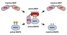 MAPK фосфатазы присутствуют только у эукариот и отрицательно регулируют митоген-активируемые протеинкиназы (MAPK), участвуя в цикле регуляции на этапе тушения сигнала[5]. Эти фосфатазы известны как фосфатазы двойной специфичности (dual-specificity phosphatases; DUSP)[6], поскольку способны дефосфорилировать как треонин, так и тирозин в каталитических центрах MAPK[7]. MAPK фосфатазы содержат активный участок на C-конце молекулы, а регуляторный участок — на N-конце[2]. Участок взаимодействия фосфатазы с протеинкиназой расположен на N-конце фосфатазной молекулы. Процесс опосредован электростатическими связями положительно-заряженных аминокислот на фосфатазе с отрицательно-заряженными остатками на связывающем участке молекулы протеинкиназы[8].