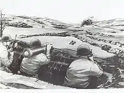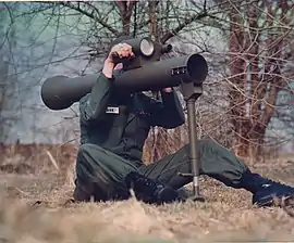 ![]() Стрелок с комплексом на плече в положении для стрельбы сидя, осень 1966 года | |