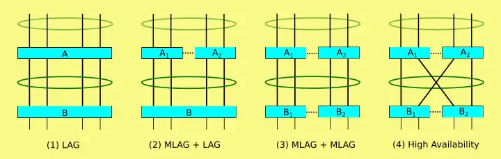 MC-LAG добавляет резервирование уровня узла к нормальному резервированию уровня канала, которое предоставляет LAG. Это позволяет двум или более узлам совместно использовать общую конечную точку LAG. Множественные узлы представляют одиночный логический LAG к удаленному концу. Обратите внимание, что реализации MC-LAG зависят от поставщика, но взаимодействующие коммутаторы остаются внешне совместимыми со стандартом IEEE 802.1 AX-2008.[2] Узлы в кластере MC-LAG взаимодействуют для синхронизации и согласования автоматических переключений (аварийного переключения). Некоторые реализации могут поддерживать инициированные администратором (ручные) переключения.