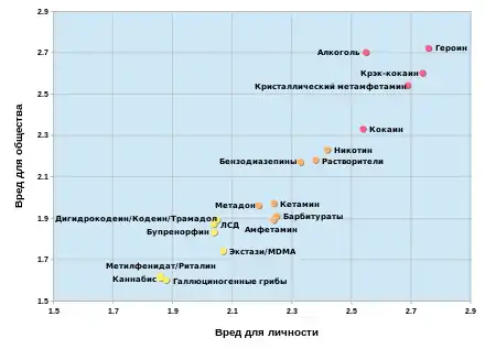 - Nutt D., King L. A., Saulsbury W., Blakemore C. Development of a rational scale to assess the harm of drugs of potential misuse (англ.) // The Lancet. — Elsevier, 2007. — Vol. 369, no. 9566. — P. 1047—53. — ISSN 1474-547X. — doi:10.1016/S0140-6736(07)60464-4. — PMID 17382831.