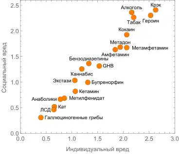 В 2010 году Натт с соавторами опубликовали в журнале Lancet экспертную шкалу вредности рекреационных наркотиков[71], вызвавшую очередные жаркие дебаты, как научные[72], так и публичные[66]:480. На вершине списка по вредности оказался алкоголь, опередивший даже героин, а галлюциногенные грибы и экстази оказались в хвосте[66]:480. Оценки работы варьируют от «псевдонаучного упражнения» — самые жёсткие критики отвергли саму методологию сопоставления наркотиков по вреду — до «квантового скачка» в направлении разработки более научно обоснованных и рациональных решений в наркополитике[66]:480[73], однако, по мнению Юргена Рема (англ. Jürgen Rehm), та статья, при всех её недостатках, является весьма влиятельной и открыла новую эпоху, разделив исследования в этой области на «до неё» и «после»[66]:480. Все работы, выполненные в этой парадигме экспертных оценок вреда рекреационных наркотиков различными группами экспертов, показывают высокую сходимость результатов[74]:5.