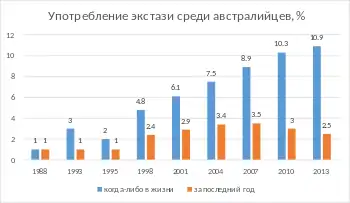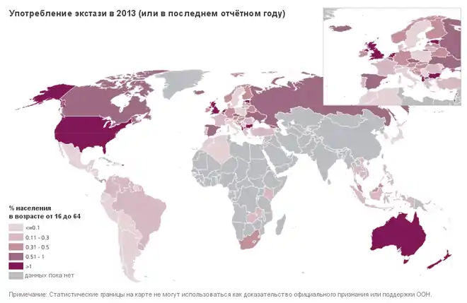 По данным исследования 2009 года, в Европе 3,3 % всех взрослых (11 миллионов человек) хоть раз пробовали в жизни экстази, а 2,5 миллиона — принимали его хотя бы раз в течение последнего года, похожие числа показало исследование 2012 года в США: 16,2 миллиона пробовавших хотя бы раз в жизни, и 2,6 миллиона принимавших его хотя бы раз за последний год[94]:245—246. Более высокие числа показало исследование European Monitoring Centre for Drugs and Drug Addiction (EMCDDA), опубликованное в 2010 году — 8,6 % взрослых европейцев (16—65 лет) хотя бы раз пробовали в жизни экстази[5]:290.