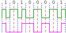 Заметим, что тактовые биты, идущие до и после последовательности, иногда известны, а иногда требуют знания дополнительных бит данных. Более длинный пример (полужирным выделены биты данных, остальные — тактовые):