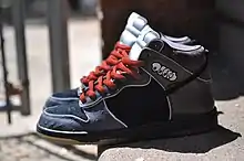 В 2007 году фирма Nike совместно с MF Doom’ом выпустила сникеры Nike SB Dunk High «MF Doom», посвящённые музыканту[9][55]. Они были окрашены в серо-чёрные тона с красными шнурками и использовали логотипы музыканта: надпись «DOOM» с обеих сторон, выполненную в стиле граффити, изображение маски MF Doom’а на язычке и металлическую застёжку с надписью «VLN» (сокращение от англ. villain — «злодей») на шнурках. Помимо этого, музыкант сотрудничал с Clarks Originals, вместе с которыми он выпустил две пары ботинок Clarks Wallabee: первый вариант был выпущен в 2013 году, сделан из кожи и окрашен в коричневый цвет[9][56], а второй, выпущенный в декабре 2014 года, был сделан из велюра, окрашенного в синий, с оранжевой подошвой — цвета баскетбольного клуба Нью-Йорк Никс, любимой команды MF Doom’а[57][58]. На обоих вариантах сбоку расположен логотип в виде маски музыканта, которая также используется внутри, в качестве повторяющегося узора[57]. К обеим парам был также прикреплён ярлык, на котором изображена надпись «DOOM» в стиле граффити[56].