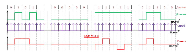 MLT-3 (Multi Level Transmission — 3) — один из способов линейного кодирования[1] (физического кодирования, канального кодирования, импульсно-кодовая модуляция[2]). Применяется для представления сигнала в соответствие с передаваемыми данными, представленных в цифровом виде. Сигнал на выходе кодирующего устройства в соответствие кодом MLT-3 представлен тремя потенциальными уровнями. Способ кодирования заключается в переключении уровня сигнала при поступлении логической «единицы». Информационный переход осуществляется в значащий момент[3][4] времени, по переднему фронту. При этом, полоса частот получается меньше, чем при кодировании NRZ кодом. Синхронизация приемника и передатчика осуществляется в моменты времени, когда на вход кодирующего устройства поступает логическая «единица», для эффективного применения стараются использовать кодируемое сообщение состоящее из максимально большого количества логических «единиц». Метод разработан Cisco Systems для использования в сетях FDDI на основе медных проводов, известных как CDDI.
