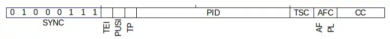 - заголовок начинается с предопределённого байта синхронизации (8 бит) 0x47 (0100 0111).
