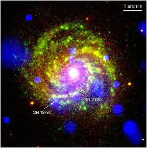 Начиная с 1901 года, в M 100 было зарегистрировано семь вспышек сверхновых: SN 1901B, SN 1914A, SN 1959E, SN 1979C, SN 2006X, SN 2019ehk[6], SN 2020oi[7].