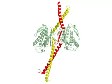 Биохимическими методами 1995 году было предсказано, что белок Mad1 представляет собой двуспиральный белок с характерной формы стержня, массой 90 кДа и включающий 718 аминокислотных остатков[9][1] . Затем в 2002 году была опубликована кристаллическая структура человеческих Mad1 в комплексе с Mad2, образующими тетрамер (см. рис.). В связи с экспериментальными ограничениями эта структура показывает только с 484-го по 584-й аминокислотные остатки, входящие в состав Mad1. Удлиненные мономеры MAD1 плотно скрепляются параллельной двойной спиралью с участием N-концевых альфа-спиралей. Цепи MAD1 указывают от двойных спиралей к их лигандам Mad2, образуя два субкомплекса с Mad2. Отрезок между альфа-спиралями 1 и 2 содержит домен для связывания Mad2. Первая часть этого связывающего домена является гибкой и принимает разные конформации, обусловливающие асимметрию комплекса. С использованием термодинамических исследований было показано, что Mad1 способен замедлять скорости образования комплекса Mad2-Cdc20 и, следовательно, выступает в качестве конкурентного ингибитора in vivo. Более того, установлено, что сайты связывания Mad1 и Mad2 находятся внутри комплекса, возможно, делая сайты связывания с Cdc20 недоступными для него. Связывание Mad1-Mad2 необычно тем, что C-конец Mad2 покрывает Mad1. В связи с этим предполагается, что неактивный комплекс Mad1-Mad2 не способен высвобождать Mad2, следовательно, для этого необходим новый, пока плохо изученный механизм конформационных перестроек комплекса[2].