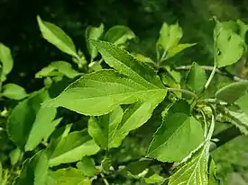 Прилистники 6—10 мм длиной, линейно-ланцетной формы, редко-опушённые, с желёзистым краем. Черешки листьев 1,5—4 см длиной, редко-опушённые, листовые пластинки 5—8×4—6 см, овальной или широко-овальной формы, с закруглённым основанием и зубчатым краем, обычно трёхдольчатые, заострённые.