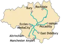 37-километровая система состоит из 3 линий с 42 станциями (в том числе 5 уличных в центре), связывающих центр города и районы Большого Манчестера Altrincham, Eccles, Бери, Oldham и Chorlton-cum-Hardy.
