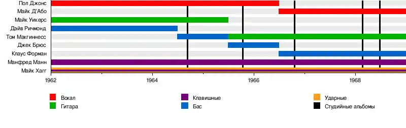 Манфред Мэнн (1962—1969) Майк Хагг (1962—1969) Пол Джонс (1962—1966) Том Макгиннесс (1964—1969) Дэйв Ричмонд (1962—1964) |
