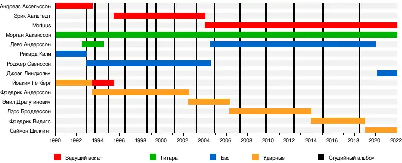 Dread (1990-1993) Rickard Kalm (1990-1992) Af Gravf (1990-1995) B. War (2002-2004) Fredrik Andersson (1993-2002) Kim Osara (1995-1996) Legion (1995-2003) Emil Dragutinovic (2002-2006) Lars Broddesson (2006-2013) Fredrik Widigs (2014 — 2018) Devo (Magnus Andersson) — (1992— 1994, 2004 — 2019) |