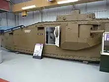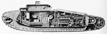 Крутящий момент от мотора передавался на два поперечных вала через коробку скоростей конструкции майора У. Дж. Вильсона. Последняя состояла их 2-х последовательно включаемых планетарных передач. Коробка давала всего 2 скорости вперёд и 2 назад, но не вызывала остановку машины при их переключении. Передача вращения с поперечных валов на ведущие колёса осуществлялась при помощи цепей Галля через бортовые передаточные колёса. Между цепями размещались бронированные бензобаки.