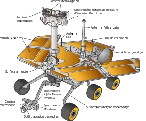 Марсоход имеет 6 колёс. Источником электроэнергии служат солнечные батареи мощностью до 140 ватт[3]. При массе в 185 кг марсоход оснащён шлифовальным станком, несколькими камерами, микрокамерой (MI) и двумя спектрометрами, смонтированными на манипуляторе[4][5].