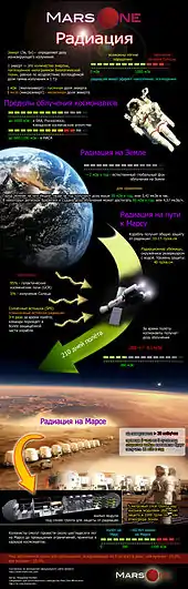 В исследованиях, опубликованных в журнале Science[46] в мае 2013, подсчитано, что радиоактивное облучение за 360-дневный полёт туда и обратно составляет 662 ± 108 миллизивертов (мЗв) — как измерения детектором радиоактивной экспертизы (RAD) (англ.). Исследования показывают, что 95 % радиации, принятой прибором RAD приходится на галактические космические лучи, от которых трудно защититься без использования непозволительно большой экранирующей массы[47]. В 210-дневном путешествии поселенцы Mars One получат дозу радиации, равную 386 ± 63 мЗв, учитывая за стандарт самые свежие данные измерений. Облучение будет ниже верхней границы принятых норм в карьере космонавтов: в Европейском, Российском и Канадском Космических Агентствах предел составляет 1000 мЗв, в НАСА — 600—1200 мЗв, в зависимости от пола и возраста.