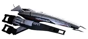 Корабль «Нормандия» (англ. «Normandy SR-1») — экспериментальный фрегат, созданный учёными Альянса систем совместно с турианскими специалистами, и основное средство перемещения между планетами[8]. На борту корабля игрок может взаимодействовать с членами экипажа, выбирать экипировку, перемещаться между созвездиями с помощью схематичной карты галактики, а также исследовать поверхность планеты на наличие артефактов и ресурсов с помощью боевого вездехода M35 «Мако» (англ. M35 Mako)[4], который также может обстреливать противников на дальнем расстоянии и способен защищать персонажей от неблагоприятных условий на некоторых планетах. У продавцов на планетах и космических станциях можно приобрести дополнительные улучшения, оружие, экипировку, а также объекты для украшения корабля[8][9].