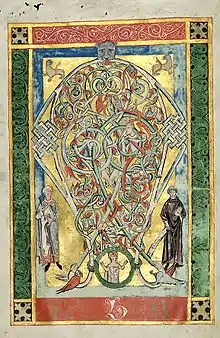 На первой чистой странице имеется только отметка Брезницкой библиотеки. Всю другую страницу этого же листа занимает слово Abba (см. рис. 1). Ветви, из которых составлена первая буква, различных красок, оживлены листьями и животными (обезьяны, сова, львы и т. д.). В орнаментике находим также скрипача и в круглом медальоне грудной портрет надписью Estas Siva. Первые исследователи видели в этом портрете изображение языческой богини Живы с колосьями в руках, однако в 1877 году Антонин Баум высказал сомнения в подлинности подписи, отметив, что портрет изображает юношу с геральдическими лилией и трилистником в руках[1].