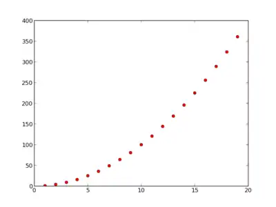 [i * i for i in range(1, 20)], 'ro')