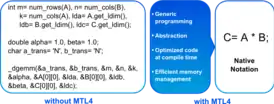 MTL использует шаблоны C++, которые значительно сокращают код программы. Все матрицы и векторы допустимы во всех классических числовых форматах: float, double, complex <float> или complex <double>.