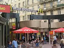 В дальнейшем сеть «Макдоналдсов» в России развивалась всё более быстрыми темпами. В апреле 1994 года появился первый ресторан за пределами Москвы — в Мытищах, в 1996 году — первый в России ресторан с функцией «МакАвто» (обслуживание клиентов, подъезжающих на автомобилях) — в Москве. В сентябре 1996 года открылся первый ресторан в Санкт-Петербурге на Каменноостровском проспекте. К 1999 году работало 50 предприятий быстрого обслуживания[6], работавших помимо двух столиц и Подмосковья также в Нижнем Новгороде, Самаре, Казани, Воронеже и Ярославле.