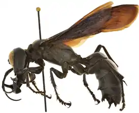 Тело самца имеет длину 32—34 мм (переднее крыло — 24—25 мм). с очень большими челюстями, которые сравнимы с длиной передних ног и завёрнуты в обе стороны от головы. Самки (длина тела — 20—22 мм; переднее крыло — 19—20 мм) чуть меньше самцов, но всё равно больше, чем самки других видов ос подсемейства Larrinae. Обладает сходством с крупными осами родов Dalara и Paraliris[1]. Является хищником, поедает других насекомых. За свой устрашающий вид получил прозвище «комодский варан» среди ос.