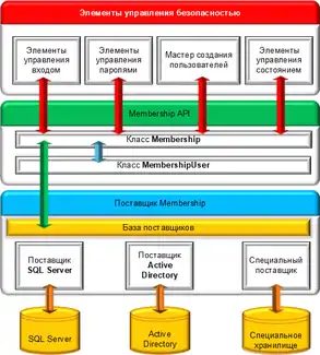 Согласно архитектуре Membership API данные о пользователе могут храниться в базе данных SQL Server, либо в Active Directory, либо в другом специальном месте. Работу с хранилищем и представление интерфейса работы с ним обеспечивается поставщиком Membership[5].