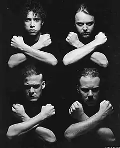 Metallica — пятый студийный альбом одноимённой американской метал-группы, выпущенный 12 августа 1991 года, также известный как The Black Album (с англ. — «Чёрный альбом»)[комм. 1]. Первый альбом группы, записанный с продюсером Бобом Роком (впоследствии его называли «человеком, принёсшим колоссальный успех группе Metallica»)[9], который пришёл на смену Флеммингу Расмуссену, занимавшемуся созданием трёх предыдущих дисков коллектива. Рок, до этого продюсировавший такие глэм-металлические команды, как Bon Jovi и Mötley Crüe, подталкивал группу к музыкальным экспериментам, за счёт чего звучание Metallica разительно отличалось от четырёх предыдущих альбомов — песни стали медленнее и короче[комм. 2]. Как отмечали эксперты, группа «сильно упростила свой саунд»[9] (намекая, что это был уже не метал)[10][11], что вызвало острую полемику как в музыкальном сообществе, так и среди фанатов коллектива[12]. Многие начали обвинять группу в продажности[13][14].