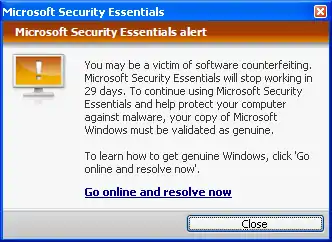 Microsoft Security Essentials постоянно проверяет валидность операционной системы во время и после установки. Если операционная система не будет распознана как подлинная, то антивирус будет уведомлять пользователя об этом, а затем перестанет функционировать, после определённого периода времени[16].