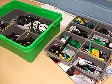 Наборы LEGO Mindstorms комплектуются набором стандартных деталей LEGO (балки, оси, колеса, шестерни, сервомоторы) и набором, состоящим из сенсоров, двигателей и программируемого блока. Наборы делятся на базовый и ресурсный.